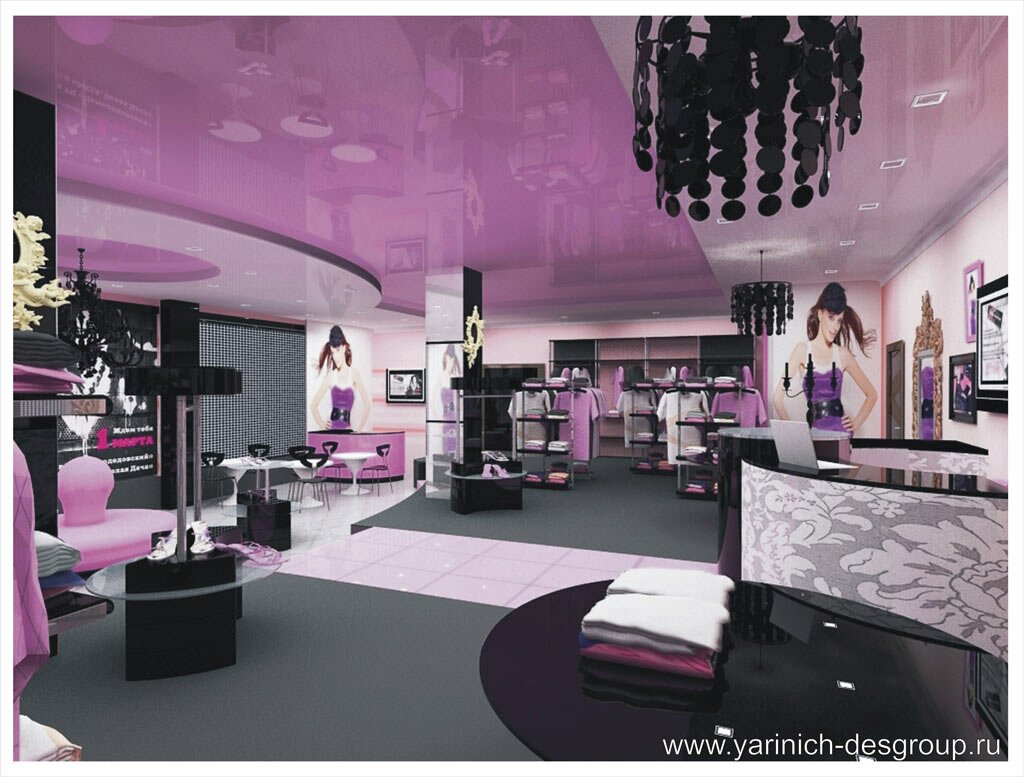 Второй уровень магазина, где находится часть оборудования, кассовая стойка, натяжной глянцевый розовый потолок, линия из розового ковролина на полу указывает направление к стойке расчета, красивые черные люстры из бусин над стеллажами, стойка выполнена из пластика и серым классическим узором.